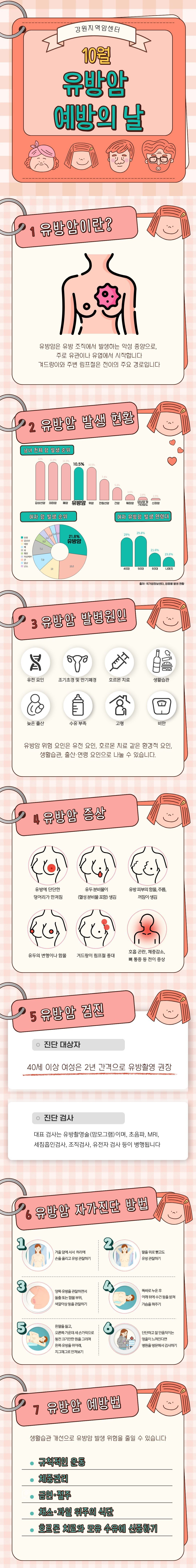 카드뉴스와 콘텐츠를 통해 유방암의 위험요인, 예방수칙, 조기검진 방법, 올바른 자가검진 요령 등을 쉽게 확인하실 수 있습니다.